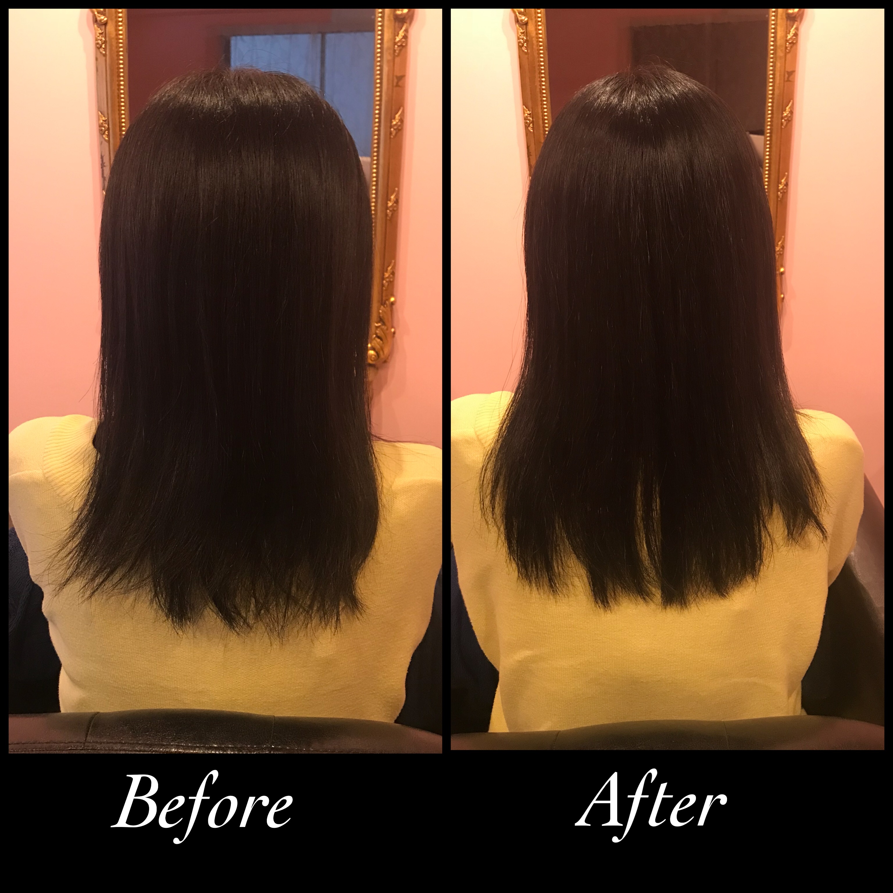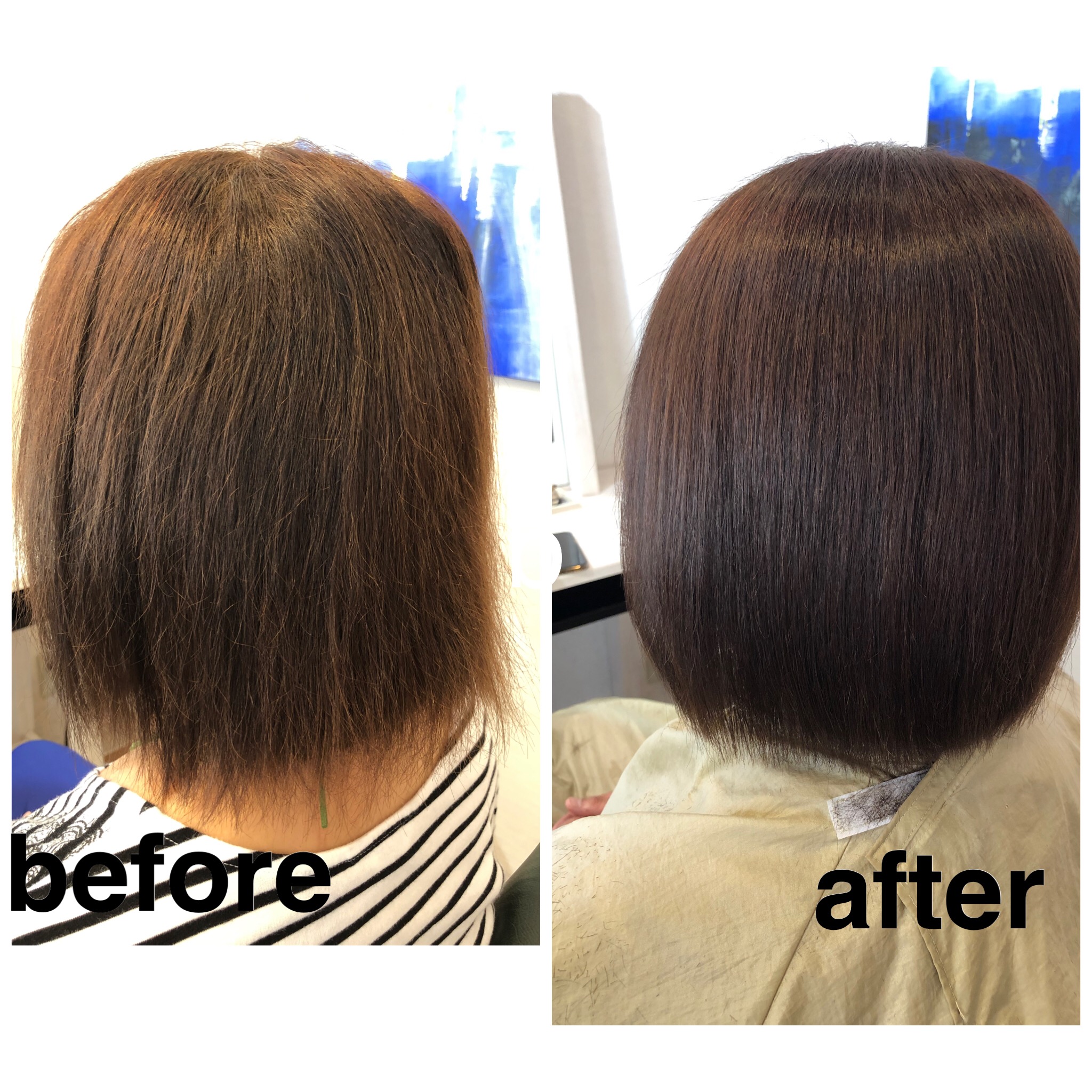 お客様に必要な栄養分を補給し閉じ込めた事とお家でのお手入れの仕方のアドバイスをさせて頂き実践して頂いた結果 おさまりが良くお手入れが楽になりました。もともと大きなダメージはなくツヤもある状態でしたがこれからもっと輝くようなツヤになっていきます!